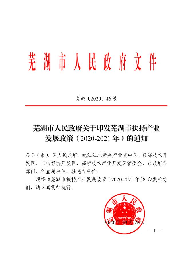 蕪湖市人民政府關于印發(fā)蕪湖市扶持產業(yè)發(fā)展政策(2020-2021年)的通知