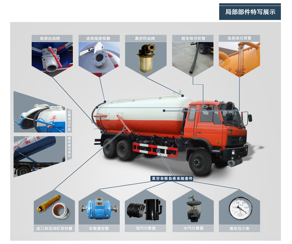 標(biāo)準(zhǔn): 吸污車:專用部分由取力器、傳動軸、真空吸污泵、水氣分離器、油氣分離器、多路換向閥、吸污罐、吸污管道、清水箱、視位管、真空壓力表、管網(wǎng)系統(tǒng)、液滿報警系統(tǒng)等組成。廣泛適用于大、中、小城鎮(zhèn)環(huán)衛(wèi)、市政、農(nóng)業(yè)、化工、廠礦企業(yè)、物業(yè)小區(qū)使用。采用二類汽車底盤改裝,罐體可舉升自卸,罐體后蓋可液壓打開。